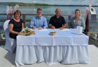 Braunsbedra, 25. Juli 2025 – In feierlichem Rahmen wurde am vergangenen Freitag der Vertrag für zukünftige Hochzeiten an der malerischen Seebrücke in Braunsbedra unterzeichnet. Bürgermeister Steffen Schmitz, Standesbeamtin Andrea Peter-Silie, eine ihrer zukünftigen Nachfolgerinnen Jennifer Sterzel sowie Hochzeitsausstatter Ron Tschörtner nahmen an der Zeremonie teil.