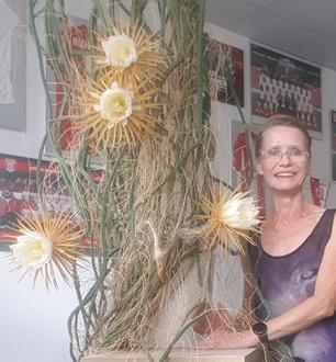 Dieser besondere Kaktus ist im Besitz von Frau Tatjana Manteuffel. Innerhalb von zwei bis drei Stunden entfalten sich seine Blüten. Vor Einbruch der Dunkelheit erreichen die Blüten einen Durchmesser von bis zu 25cm. In diesem Jahr hatte sie sogar 2x Glück. Der Kaktus Blüte am 06.07.2023 mit 2 Blüten und am 19.07.2023 dann mit 4 Blüten. Die Großkaynaerin hat ein glückliches Händchen.