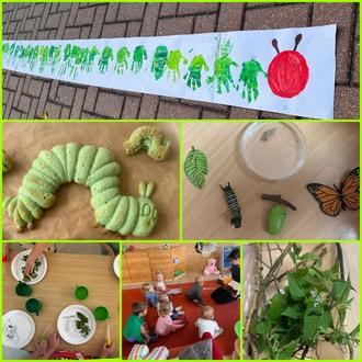 Im August und September beschäftigten wir uns mit dem Projekt "Raupe Nimmersatt". Wir beobachteten täglich die Verwandlung von der Raupe zu einem wunderschönen Schmetterling. Jede Woche warteten neue, spannende Angebote auf die Kinder und jeder Gruppenraum wurde toll gestaltet. Jedes Kind konnte seine eigene Raupe selbst anfertigen, wir sangen viele Lieder und bekamen sogar eine Buchvorstellung von Frau Wust aus der Bücherei. Als Gemeinschaftsarbeit entstand aus zahlreichen Handabdrücken die längste Raupe und in einem Experiment ließen wir magische Wasserraupen entstehe. Beim Kuchen backen halten alle fleißigen Kuchenbäcker mit und am Ende ließen wir uns die leckeren Raupen schmecken. Die Kinder beobachten jetzt noch intensiver die Natur, wo sich vielleicht eine Raupe versteckt hat oder ein wunderschöner Schmetterling zu sehen ist.