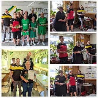 Die Urkunden wurden standesgemäß vom Kegelverband um Marina Kriese übereicht. Auch wurde ein kleines Turnier gespielt wo aus allen drei Gruppen: Frauen, Senioren und Männern jeder gegen jeden gespielt wurde. Und es sollte sich zeigen, egal ob Frau oder Mann kegelt, am Ende wird abgerechnet. So trafen im Finale mit Lydia Fügner und Max Knopf beide Geschlechter aufeinander. Hier konnte Max Knopf sich knapp durchsetzen und den Wanderpokal gewinnen. Die beiden 3. Plätze belegten Dietmar Apitzsch und Alexander Bräunig. Es gab auch noch kleine Präsente, die Simon Wald organisierte. Zum Abschluss wurde noch schön gegrillt und der Abend in der gemeinsamen Runde genossen.