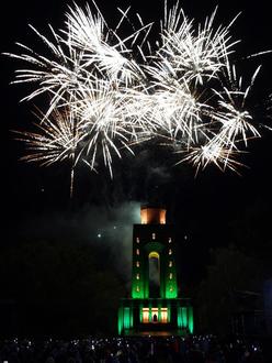 Prächtige Feuerwerke über dem Bismarckturm gibt es bei der Sagennacht und bei der Nacht der Kürbisgeister.