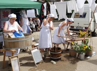 Die Waschfrauen auf dem Handwerker- und Bauernmarkt: Wäschewaschen wie früher mit Stampfer, Waschbrett und großen Wannen.