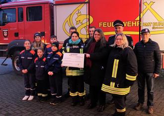 Spendenübergabe von Anke Wislaug (M.) an Mitglieder der Kinder- und Jugendfeuerwehr mit den Jugendwartinnen Yvonne Halko und Michelle Schneider sowie weiteren Vertretern der Ortswehr um Chef Uwe Bertels.