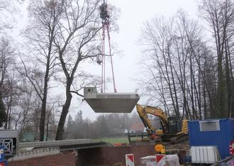 Die neue Brücke über das „Stille Fließ“ in der Burger Waldschlösschenstraße steht vor ihrer Fertigstellung (Ende 1. Quartal 2024). Im Dezember wurden per Kran zwei Überbau-Fertigteile, die in Lauchhammer vorgefertigt worden waren, auf die Widerlager gehoben. Auch der Wintereinbruch Ende November brachte die Baustelle nicht zum Stoppen. In einer beheizbaren Einhausung konnte trotz Frost der Unterbau verklinkert werden.