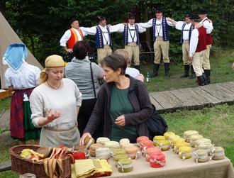 Auf der Wiese, auf einem kleinen sorbischen Markt werden Bücher angeboten, es wird gesponnen und gestickt, es werden Porträts gezeichnet, und es sind ganz viele Informationen über das sorbische/wendische Leben und über den sorbischen Kulturtourismus zu erhalten.