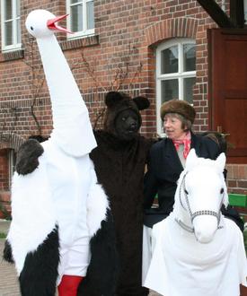 Regina Herrmann (r.) begeistert nicht nur mit ihren puppenartigen Figuren zur Sagenwelt, sondern zeichnete auch für die Zamperkostüme nach historischem Vorbild verantwortlich, die 2009 für das Heimatmuseum Dissen angefertigt wurden. Im Bild dargestellt werden (v. r.): Schimmelreiter, Bär und Storch.