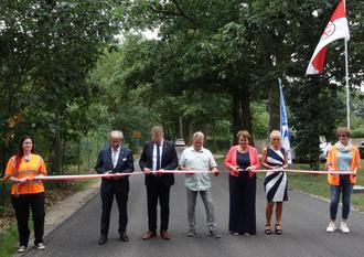 Straßenfreigabe in Drachhausen (v. l.): Landrat Harald Altekrüger, Verkehrsminister Rainer Genilke, Drachhausens Bürgermeister Ronny Henke, Dr. Ina Bartmann, Vorstandsvorsitzende des Landesbetriebes und Ira Frackmann, Bürgermeisterin Schmogrow-Fehrow.