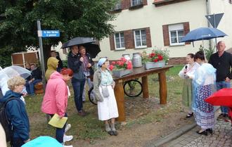 Die Initiatoren aus Striesow/Strjažow, die sich für die Bewerbung stark gemacht hatten, konnten viele engagierte Einwohnerinnen und Einwohner gewinnen, den zweieinhalbstündigen Jurybesuch zu begleiten und zu unterstützen. Ob Feuerwehr, Jugend, Traditionsverein, Kita, Back- und Sportfrauen, Kirchengemeinde oder Unternehmer und Landwirte – alle sorgten dafür, dass sich das Dorf von seiner besten Seite zeigen konnte – auch während eines kurzen, aber kräftigen Regenschauers. Sylvia Hutengs wusste zu berichten, dass Striesow/Strjažow einst bedeutender als der Nachbar, das vielfach ausgezeichnete Dissen/Dešno, war; stand doch hier eine Slawenburg, eine Schutzburg, in der sich bei Gefahr Dissener und Striesower zurückziehen konnten. Nach dem Blick zurück, gab es aber auch Zukunftspläne zu hören, z. B. von dem Rundweg, der mittelfristig Einheimische, aber auch Gäste durch das Dorf führen und über spannende Daten und Geschichten informieren soll. Die Bücherzelle, die seit einigen Wochen zum Büchertausch an der alten Schule einlädt, wird demnächst mit einem „offenen und grünen Klassenzimmer“ erweitert. Gezeigt wurde der Jury, welche Potenziale das Dorf hat mit dem Sportplatz, dem Marienberg und der Kita. Diese träumt von einer eigenen Küche, in der das Essen für die Kinder, aber auch für die Seniorinnen und Senioren des Dorfes gekocht wird.
