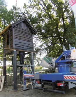 Die "Räubehütte" wird per Kran auf ihre Stützen gestellt.