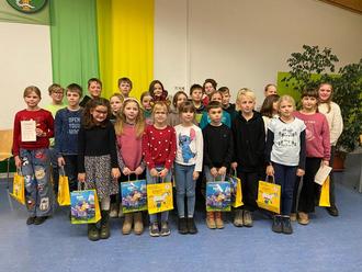 Das Gruppenfoto zeigt Kinder, die am 17. Schreibwettbewerb teilgenommen haben.