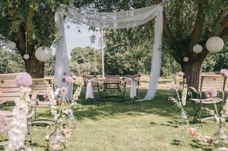 Heiraten romantisch im Freien am Alten Backhaus. Zu den 13 gewidmeten Trauorten gehören seit 2024 auch wieder die Alte Schule und die Kolonieschänke.