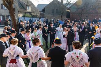Am Kriegsmahnmal nahe dem Glockenturm formierten sich die 18 Paare im Halbkreis und verharrten in einer Schweigeminute. Dies wurde von den Zuschauern als besonders lobenswert wahrgenommen, denn die Namen der Toten auf den Tafeln erinnern an jene, deren Leben in zwei sinnlosen Kriegen geopfert wurden, und die oft verbunden sind mit der eigenen Familiengeschichte. Nach dem stillen Gedenken nahmen die Herren ihre Hüte wieder auf und setzten mit ihren Damen den Umzug fort. Voran gingen Pascal Kuba und Kim Mucha sowie Emely Schneider mit Christian Petatz; er hatte den Blumenkorb zu tragen, der in der Folge des Umzugs etwas leichter wurde, denn an elf Stationen erfolgte ein herzliches Dankeschön an die Sponsoren. Nach einer Kaffeepause in der örtlichen Feuerwehr ging es wieder zurück in den „Dorfkrug“ zum abschließenden Tanz. (red/P. Becker)