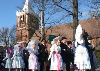 Ein Fastnachtsumzug zieht an der Werbener Kirche vorbei. Dieser ist der Mittelpunkt des Dorfes und von weitem sichtbar. Nun muss das Dach saniert werden, weshalb die Kirchengemeinde um Spenden bittet.