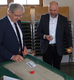 Bei seinem letzten Arbeitsbesuch im Amt Burg (Spreewald) im vergangenen Frühjahr versuchten sich von Landrat Harald Altekrüger (l.) und Amtsdirektor Tobias Hentschel am Waleien, dem Ostereierkullern.