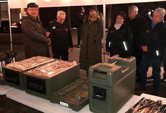 Die bisher genutzten einfachen Styroporboxen waren inzwischen in die Jahre gekommen, und so war die Ortswehr sehr erfreut, als Familie Wahlich ihre Unterstützung zugesagt hatte. Zwei Warmhalteboxen mit Edelstahleinsätzen für Lebensmittel und eine für Suppen oder heiße Getränke konnten angeschafft werden, alles aus stoßfestem Material und einfach zu reinigen. Dazu eine große Kaffeemaschine, eine Induktionsplatte für einen großen Topf inklusive Topf, Pumpkannen, Schneidebretter, ein Messersatz und diverses Kleinzubehör. Hinzu kommt ein großes Überzelt, dessen Beschriftung „FF Burg-Kauper Versorgung“ den Kameradinnen und Kameraden bei Einsätzen den Weg zur Stärkung.
