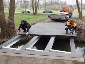 Oliver Lehmann und Guido Lichterberger vom Bauhof legen die Kunststoffbohlen auf.