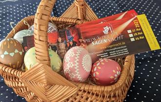 Karten für die Spreewälder Sagennacht passen wunderbar ins Osterkörbchen. Erhältlich sind sie zum Preis von 29,50 Euro für Vollzahler, ermäßigt 15 Euro, in der Touristinformation in Burg (Spreewald)/Bórkowy (Błota) sowie im Onlineshop auf www.burgimspreewald.de.