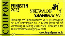 Die Einwohnerinnen und Einwohner des Amtes Burg (Spreewald) können sich erneut über eine Besonderheit freuen. Sie erhalten bei Vorlage des untenstehenden Coupons eine Ermäßigung auf den Kauf von zwei Eintrittskarten für die Vorstellung am Montag, dem 29. Mai (Gilt nur bei Kauf in der Touristinformation!).
