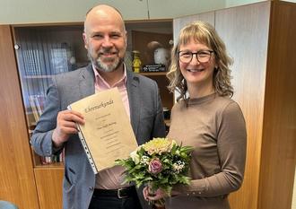 Zum 25-jährigen Dienstjubiläum gratulierte Amtsdirektorin Tobias Hentschel der Mitarbeiterin der Hauptverwaltung Steffi Balting. Die Burgerin hat bereits ihre Ausbildung im Amt Burg (Spreewald) absolviert sowie von 2012 bis 2015 das Studium zur Verwaltungsfachwirtin. Seit 2009 ist sie für das Personalwesen zuständig.