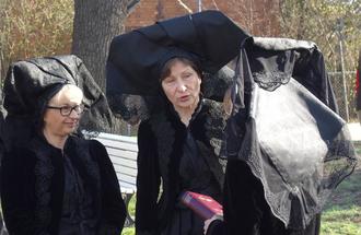Wendischer Kirchgang an der Burger Kirche: Die Frauen tragen die schwarze Kirchgangstracht.