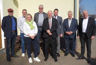 Amtsdirektor Tobias Hentschel (l.) konnte die Mitglieder der Kreisarbeitsgemeinschaft, also die Bürgermeisterinnen und Bürgermeister sowie Amtsdirektorinnen und Amtsdirektoren aus den benachbarten Kommunen des Landkreises, zur Beratung in Burg (Spreewald)/Bórkowy (Błota) begrüßen (v. r.): Dieter Perko (Neuhausen/Spree), Norbert Krüger (Peitz), Ralph Homeister (Schenkendöbern), Fred Mahro (Guben), Hilmar Mißbach (Welzow), Simone Taubenek (Forst/Lausitz) und Karsten Schreiber (Kolkwitz).