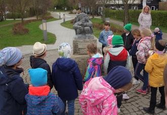 Kinder aus dem Burger Hort „Lipa“ lauschen an der Skulptur des Wassermanns im Kur- und Sagenpark aufmerksam der gleichnamigen Sage. Diese ist, wie viele weitere Geschichten, über die neue Audiotour zu erhören. Dazu muss man mit dem Handy einfach nur den QR-Code scannen.