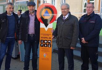 Am Standort der Grund- und Oberschule "Mina Witkojc" wurde der erste Katastrophenschutz-Leuchtturmes im Spree-Neiße-Kreis vorgestellt (v. l.): der stellvertretende Bürgermeister Bernd Ragotzky, Amtsdirektor Tobias Hentschel, Landrat Harald Altekrüger und Amtsbrandmeister Markus Weber. In der Mitte das Hinweisschild, das auf die Anlaufstelle hinweist.