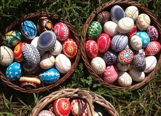 In drei Weidenkörbchen liegt eine Auswahl sorbischer Ostereier, die 2025 im Heimatmuseum Dissen entstanden sind.