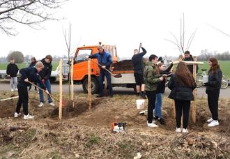22 Apfel- und Birnenbäume brachten die Schülerinnen und Schüler der Klassen 10 und 8 b nun unter Anleitung und mit Unterstützung des Bauhofes in die Erde; bauten die Pflanzböcke selbst, düngten, banden die Bäume an und versahen sie mit Witterungsschutz.