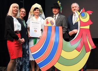 Dissen-Striesow/Dešno-Strjažow. Alle Augen waren auf die über 40-köpfige Dissener Delegation gerichtet, als die Frauen in ihren wendischen Trachten mit Haube und die Männer mit Anzug und Fastnachtstrauß am Hut in den Festsaal einmarschierten. Einen Blickfang boten die Frauen und Männer aber auch bei den Abendveranstaltungen sowie bei der Ausstellung mitten im Zentrum von Hofheim. Der Preisträger des vorherigen Wettbewerbs, die Allianz Hofheimer Land, war Gastgeber der zweitägigen Auszeichnungsveranstaltung. An den Markständen mitten im Zentrum von Hofheim stellten sich die teilnehmenden Dörfer und Regionen vor. Viele hatten regionale Spezialitäten mitgebracht, informierten über ihre Besonderheiten, sorgten mit Gesang und Vorführungen für Stimmung. Die Dissener Delegation hatte neben vielen Informationsmaterialien kulinarische und kunsthandwerkliche Besonderheiten aus dem Spreewald mitgebracht, wie (natürlich) Spreewälder Gurken, sorbische Ostereier, Blaudruck und Spreewaldbitter. Begeistert wurden Leinöl mit Zucker oder Salz gekostet oder Kostproben von frisch angerührtem Quark und Leberwurstschnittchen. Vor dem Stand tanzten die Dissener*innen gemeinsam mit Passanten die Annemariepolka. Auch zum kleinen Sorbisch/Wendisch-Sprachkurs waren Interessierte eingeladen. Und es wurden Brücken gebaut. So sang man gemeinsam mit der Thallwitzer Delegation aus Sachsen, mit den Tschechen aus Ratiboř oder versuchte sich im Alphornblasen.