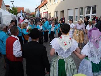 Die Delegationen aus Dissen/Dešno und Thallwitz in Sachsen beim gemeinsamen Singen im Hofheimer Zentrum.