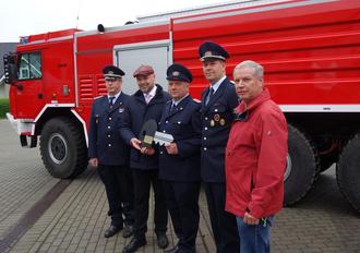 Im Beisein von Amtswehrführer Marcus Weber (l.) und dem Vorsitzenden des Amtsausschusses, Joachim Dieke (r.) übergibt Amtsdirektor Tobias Hentschel (2. v. l.) den symbolischen Fahrzeugschlüssel für das hinter ihnen stehende GTLF an Gerätewart Jens Buder (m.) und Ortswehrführer Daniel Scheiter.