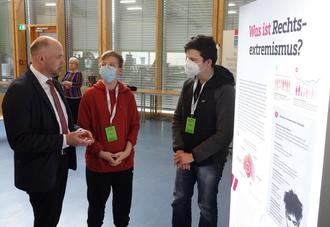 Amtsdirektor Tobias Hentschel im Gespräch mit zwei Schülern in der Ausstellung "Demokratie stärken - Rechtsextremismus bekämpfen" 2022