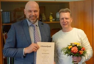 Seit 25 Jahren ist der Burger Jörg Wöltche in der Amtsverwaltung tätig. Amtsdirektor Tobias Hentschel gratulierte zum Jubiläum. Nach seiner Ausbildung zum Verwaltungsfachangestellten und Tätigkeit in der Kreisverwaltung Spree-Neiße ist der ehemalige Leistungssportler (Turnen, u. a. Deutscher Mannschaftsmeister 1991 mit dem SC Cottbus);-) oder Jörg Wöltche seit 1999 als Sachbearbeiter Gewerbeangelegenheiten im Amt Burg (Spreewald) tätig. Als Elternzeitvertretung leitete er vor einiger Zeit übergangsweise die Ordnungsverwaltung.