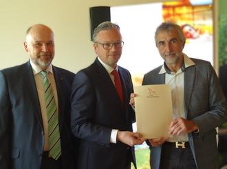 Burg im Spreewald ist Thermalsoleheilbad: Brandenburgs Gesundheitsstaatssekretär Patrick Wahl (m.) überreicht die Urkunde an Bürgermeister Bernd Ragotzky (r.) und Amtsdirektor Tobias Hentschel (l.).