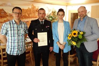 In der Sitzung des Amtsausschusses am 28. April wurde Hauptbrandmeister Dusty Gorenz zum stellvertretenden Amtswehrführer der Freiwilligen Feuerwehr Amt Burg (Spreewald) berufen. Voraussetzung dafür war eine umfangreiche Qualifizierung, die er nach seiner kommissarischen Ernennung im Jahr 2023 erfolgreich absolviert hat. Es gratulierten Amtsausschussvorsitzender Frank Engelking (l.), die Amtsleiterin der Ordnungsverwaltung Susanne Ragotzky /2. v. r.) und Amtsdirektor Tobias Hentschel (r.).
