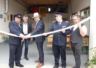 Mit dem Aufkoppeln eines C-Druckschlauches wurde das Feuerwehrgerätehaus in Müschen/Myšyn eingeweiht (v. l.): Ortswehrführer Marco Pfaffe, Bernd Ragotzky, stellvertretenden Bürgermeister von Burg (Spreewald)/Bórkowy (Błota), Amtsdirektor Tobias Hentschel, Amtswehrführer Marcus Weber und Ortsvorsteher Jens Quitz.