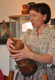 Museumsmitarbeiterin Melanie Mücksch erläutert das Butter zu Omas Zeiten