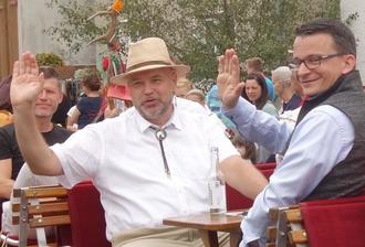 Amtsdirektor Tobias Hentschel (l.) freut sich auf das Heimat- und Trachtenfest und lädt herzlich dazu ein. Das Bild zeigt ihn mit dem Vorsitzenden des Amtsausschusses und Bürgermeister von Guhrow/Góry, Frank Engelking (r.) im Festwagen beim letztjährigen Festumzug in Dissen/Dešno. (Foto: K. Möbes)