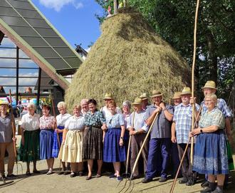 Die Mitglieder des Heimat- und Trachtenvereins nach getaner Arbeit vor dem großen Heuschober.