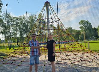 Bürgermeister Frank Engelking bei der symbolischen Übergabe der Kletterspinne an die Jugendchefin Marie Nippe.