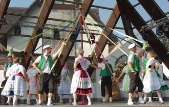 Schmogrow hat bisher kaum auf einem Heimat- und Trachtenfest gefehlt; präsentierte sich im Festumzug oder auf der Festbühne, wie hier der Traditionsverein beim Bändertanz. In diesem Jahr wird Werbung gemacht für das eigene Jubiläumsjahr 2026.