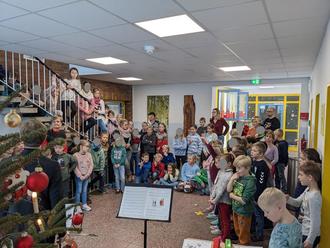 Beim Treppensingen am 20.12. erklang unser weihnachtlich geschmücktes Schulhaus durch den Gesang der gesamten Schüler- und Lehrerschaft. Es wurden verschiedene Winter- und Weihnachtslieder gemeinsam gesungen. Der Chor unserer Grundschule trug einige Lieder vor. Und sogar einzelne Musiker trauten sich, mit ihrem Instrument aufzutreten. Unter anderem hörten wir zwei Flötenstücke von Laura. Toni mit dem Kontrabass und Herr Schmerler mit dem Cello spielten gemeinsam einige weihnachtliche Weisen.