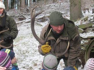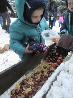 Auf unserem weiteren Weg durch den Wald konnten wir viele Beobachtungen machen und wichtige Erfahrungen sammeln. Gleichzeitig erfuhren wir viel Interessantes über die heimischen Waldbewohner. An der Futterstelle angekommen, durften wir selbst verschiedenes Futter, wie z.B. Maiskörner, Kastanien, Heu, Rüben und Möhren, verteilen. Somit hatten die Tiere für die nachfolgende Zeit reichlich Nahrung. Zwischendurch erklärte uns Herr Heidelbacher Wissenswertes über das Verhalten von Wildschweinen, Rehen, Füchsen und anderen Tieren.