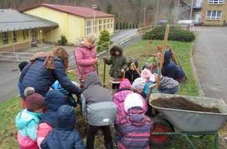 Da das Wetter in diesem Jahr etwas verrückt spielt, wurde die Aktion etwas schneller und spontaner durchgeführt als gedacht. Am Freitag, dem 31.03.2023, lieferte die Baumschule Meile aus Dippoldiswalde die zwei Bäumchen (Apfelsorte „Pilot“ und „Karneval“). Unsere Baumpatin, Frau Zieschang, die auch die GTA „Naturfreunde“ betreut, machte sich auf den Weg zu uns. Mit den ersten Klassen veranstaltete sie eine Stunde rund um das Thema „Pflanzen“. Die Kinder besprachen mit Frau Zieschang wichtige Teile des Baumes und deren Funktion sowie alle Schritte, die man beim Pflanzen beachten muss. Danach ging es raus zum Pflanzen. Jeder durfte helfen und mit anpacken. Dank der Hausmeister, war das Pflanzloch schon vorbereitet und alle wichtigen Geräte standen bereit. Als erstes schaufelten die Schüler Erde ins Loch und setzen einen Drahtschutz ein. Der soll die Wurzeln vor den Wühlmäusen schützen. Dann stellten die Schüler die Bäume in die Löcher, so dass die Veredelungsstelle über dem Boden lag. Mit Erde von unserem eigenen Kompost sowie der schon vorhandenen Erde gruben sie die Bäume ein und versahen sie mit einem Schutzmantel gegen Kälte und Tiere. Natürlich durften die Kinder zum Schluss die Bäume noch reichlich gießen.