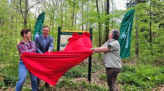 Lehrerin Chris Dittrich von der Grundschule Berggießhübel, Bürgermeister Thomas Peters und Revierleiterin Annett Wehner enthüllen schwungvoll die neue Tafel, die am Eingang des neuen Waldlehrpfades an der Rasthütte Betlehemstift steht.