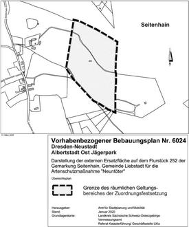 | Als Ersatzhabitat für die nachgewiesene besonders und streng geschützte Art Neuntöter wird dem Vorhabengebiet eine bereits realisierte externe Maßnahmenfläche im Umfang von 2,0 ha auf dem Flurstück Nr. 252 der Gemarkung Seitenhain, Gemeinde Liebstadt zugeordnet. |