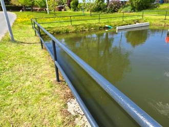 Am Samstag fuhren wir nach Oelsen und rückten mit Schleifpapier und Farbe dem Geländer am Feuerlöschteich zu Leibe. Nachdem wir die alten Farbreste mühsam abgeschliffen hatten, konnten wir den neuen Schutzlack aufbringen.