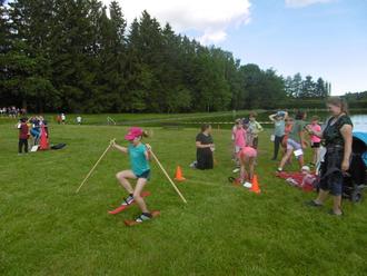 An 12 Stationen konnten sich unsere Kinder ausprobieren und miteinander wetteifern. So zum Beispiel beim Kugelstoßen, Hürdenlauf, Hockey, Speerwurf, Traktorreifen durchs Wasser ziehen, Rollerrennen...