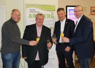 Zum Arzberger Neujahrsempfang am 12. Januar stießen die ostelbischen Bürgermeister Holger Reinboth (Arzberg) und René Vetter (Beilrode) mit Landrat Kai Emanuel (2. von rechts) und Oberbürgermeister der Stadt Torgau Henrik Simon (links) auf ein erfolgreiches, gesundes neues Jahr an.